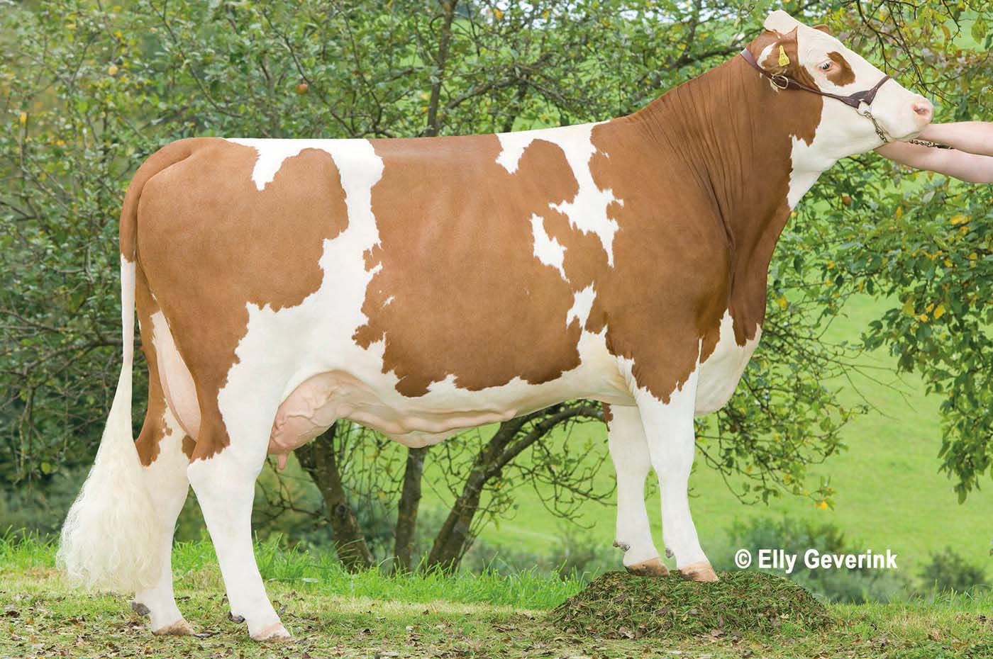 Im Exterieur sind seine Töchter im mittleren Rahmen bei durchschnittlicher Bemuskelung. Die Euter zeigen eine starke Zentralbandausprägung und einen guten Euterboden. Die Vorder-
