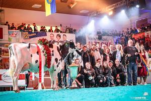 Als im Finale der älteren Holsteinkühe die sechs Finalistinnen Aufstellung genommen hatten, herrschte Gänsehautstimmung im Ring der Berglandhalle. Jede Kuh darin überzeugte die Preisrichterin als auch das Publikum mit unglaublich guter Qualität, doch am meisten begeistert war Karoline Strauß von der 1st Grade Tochter STS Fabienne EX90 von STS Holsteins und machte sie zum Senior Champion bei den Holsteins vor der Awesome Red Tochter W4 Dunja EX90 von W4 Holsteins.