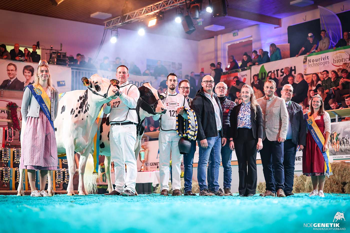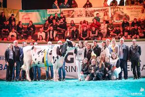 Bei spannender Musik, vollen Rängen und dunklem Licht zogen die sechs erst- und zweitplatzierten Kühe in den Ring ein und nahmen in der Ringmitte Aufstellung. Unter tobendem Applaus kürte Karoline Strauß das Siegerduo der zweiten Gruppe zum Champion und Reserve Champion der jungen Holstein Kühe. Das W4 Präfix von Thomas und Viktoria Ruthner aus Irnfritz-Messern, sicherte sich somit Titel als auch den Reservetitel Holstein jung.